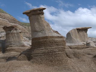Er zijn mensen die zeggen tegen een ander wel eens, meestal een ouder persoon, "fossiel". Wij hebben vandaag echte fossielen bekeken in het Royal Tyrrell Museum en het was echt de moeite waard. Voor 20 dollar(ongeveer 15 euro) voor twee personen kun je een reis door het verleden maken tot aan de tegenwoordige tijd aan toe. De gehele evolutie kan men hier zien zoals Charles Darwin die zag en beschreven heeft. Prachtig opgezet, met veel beeld en duidelijke uitgeleg. Men kan ook een audiofoon mee krijgen op zijn rondgang door het museum. Er zijn extra mogelijkheden, speciaal voor kids om buiten iets actiefs te doen wat met het museum te maken heeft. Men kan een blik werpen in de werkplaats waar men aan de gevonden skeletten werkt. Er zitten ook medewerkers in het museum zelf die ergens uitleg over geven of ergens aan zitten te werken. Buiten kan men uitgezette wandelingen maken om een beeld te krijgen in welke omgeving de dieren hebben geleefd. Na het bezoek aan het museum doorgereden naar Brooks waar we slaapplaatsen hadden gereserveerd voor de komende nachten. Natuurlijk rij je wel eens de verkeerde weg in, nu dus ook en kwamen we langs Hoo Doo's (links onder) gekeerd toen we wisten dat we een afslag hadden gemist. Toch maar even bij de door weer en wind afgesleten zandheuvels gestopt. Als het goed is komen we ze nog een keer tegen maar vele malen groter, we wachten af. Ook vandaag nog een technisch probleem opgelost. Wij hadden vergeten de verloopstekker mee te nemen uit ons hotel. Dan maar creatief zijn en de Wallmart in een paar spullen halen om het op te lossen. We slepen tegenwoordig zoveel spullen mee wat stroom nodig heeft. Een snoertje met stekkers, stekker, setje klein schroevendraaiers( wat we misschien nodig heben nemen we niet mee) en een rolletje tape en een beetje prutsen, zo ook weer opgelost. Dit houd het wel tot volgende week. Morgen gaan we in de omgeving van Brooks kijken, er zijn hier ook een paar interesante dingen te bezichtigen. |
